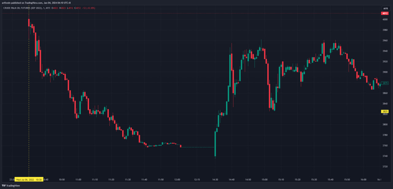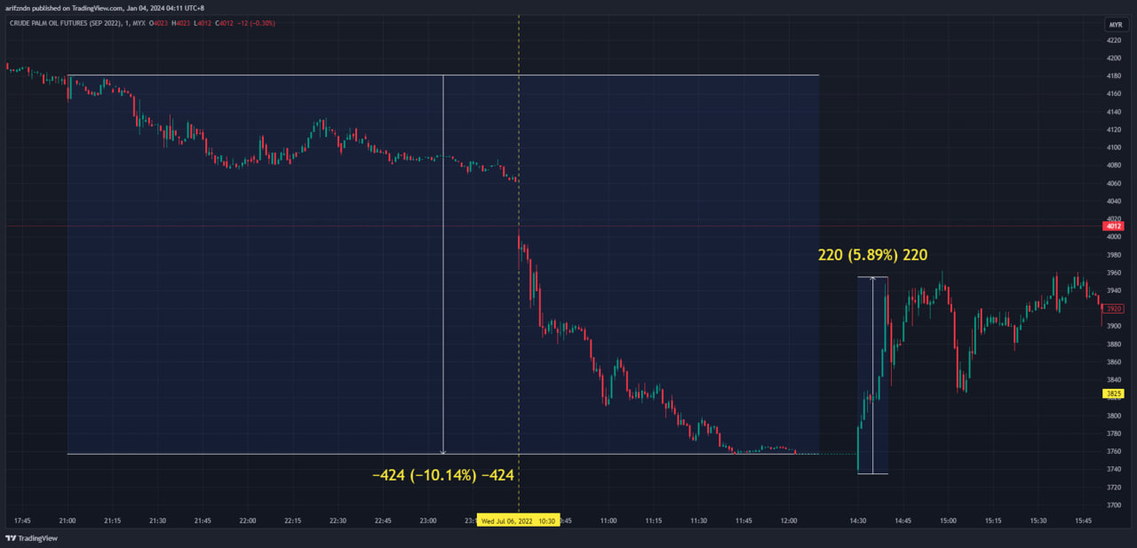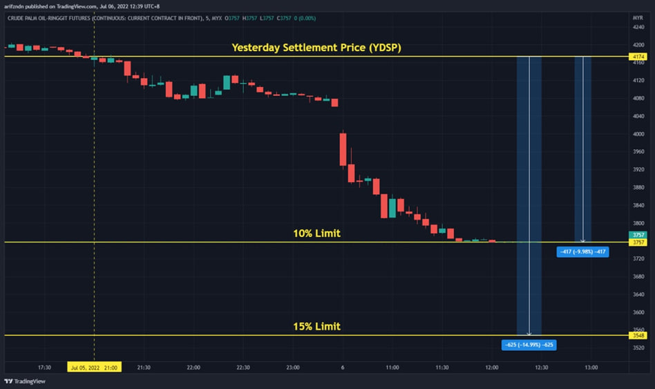Chart di atas adalah tarikh berlakunya Limit Down di FCPO iaitu pada July 6, 2022.