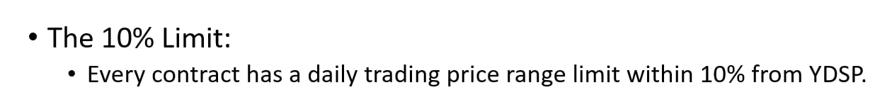 • Maksimum kenaikan/penurunan dalam masa 1 hari ialah 10% daripada YDSP (Yesterday Settlement Price).