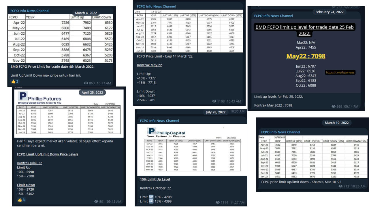 Broker-broker di Malaysia capai tahap perlu post senarai price paras Limit Up dan Limit Down bagi setiap kontrak FCPO setiap pagi, kerana menjangkakan possibility berlakunya Limit Up/Down.