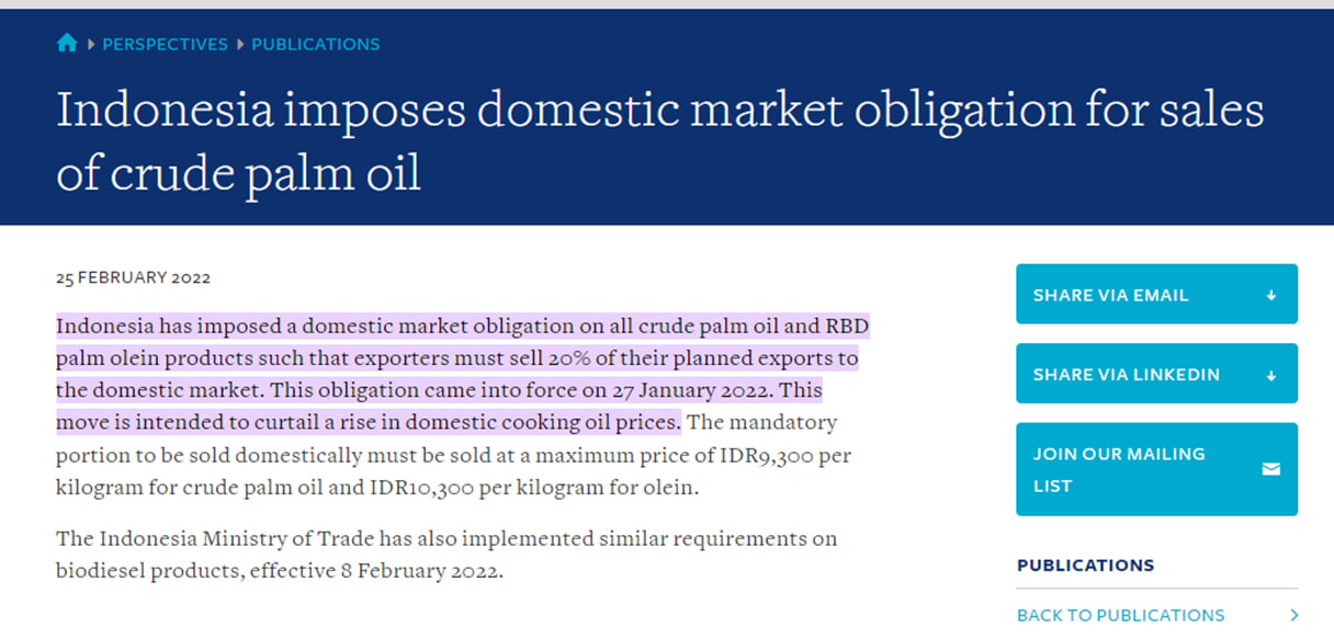 • Indonesia sebagai pengeluar CPO terbesar di dunia, menguatkuasa polisi untuk TIDAK jual CPO kepada luar negara dan hanya jual dalam negara sahaja.